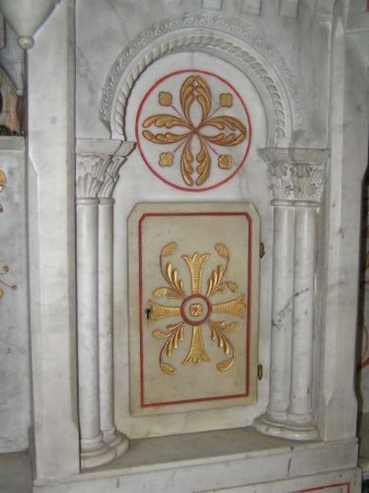 Tabernacle en marbre blanc sur l'autel de la chapelle Sainte-Germaine (PM09002582), sommé de tourelles. La façade à arc triomphal est décorée d’une rosace gravée dorée soutenu par des colonnettes à chapiteaux corinthiens.