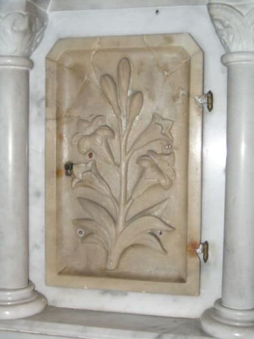 Tabernacle en marbre blanc à fronton triangulaire, façade à arc triomphal soutenu par des colonnettes à chapiteau dorique décoré au dessus d’une porte ornée d’une tige de lys fleuri.