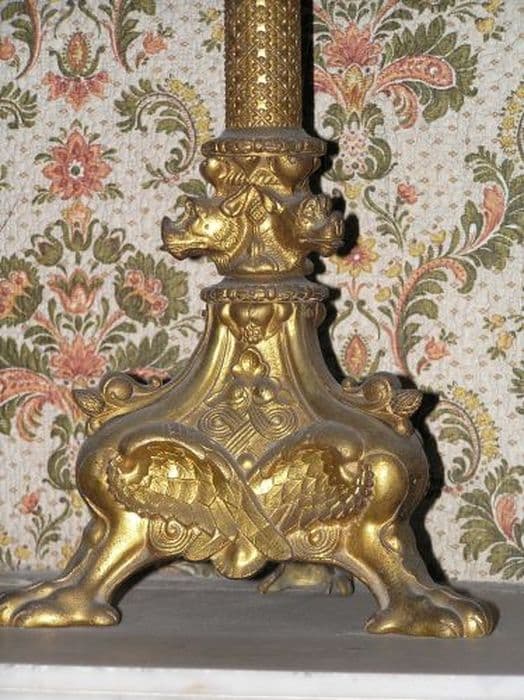 Six chandeliers en bronze sur base tripode à patte de griffonne. Partie basse chargée d’ailes. Partie supérieure pyramidale ornée de motifs baroques surmonté de trois têtes de griffon. Fût décoré. Noeud à bouton décoré d’arabesque.