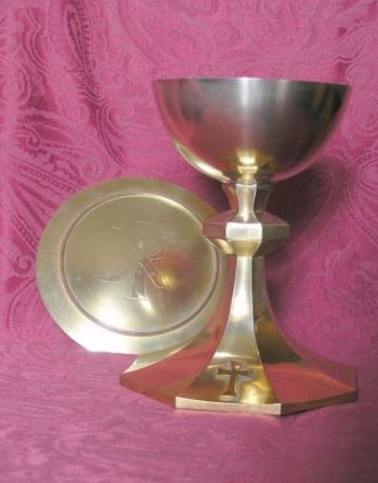 Calice en métal doré, et argent doré à l'intérieur de la coupe, accompagné de sa patène en argent doré, le tout dans un coffret parallélépipédique recouvert de toile noire, fourré de velours vert bronze. Le calice repose sur un pied octolobe frappé d’une croix latine pattée, les huit nervures réunies pour former le fût. Noeud plat à huit côtés/ Coupe hémisphérique.