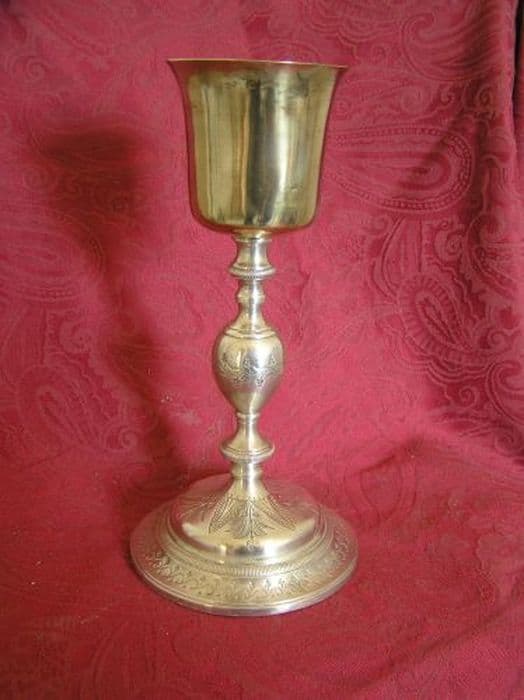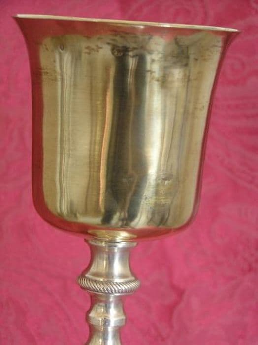 Calice en métal argenté, coupe en argent doré. Pied circulaire au redent gravé d’une guirlande. Dessus gravé de feuilles s’épanouissant du fût, le tout bordé d’une frise striée. Collerette basse striée droite. Noeud ovoïde allongé gravé d’un motif feuillé. Collerette supérieure striée en biais. Coupe épanouie.