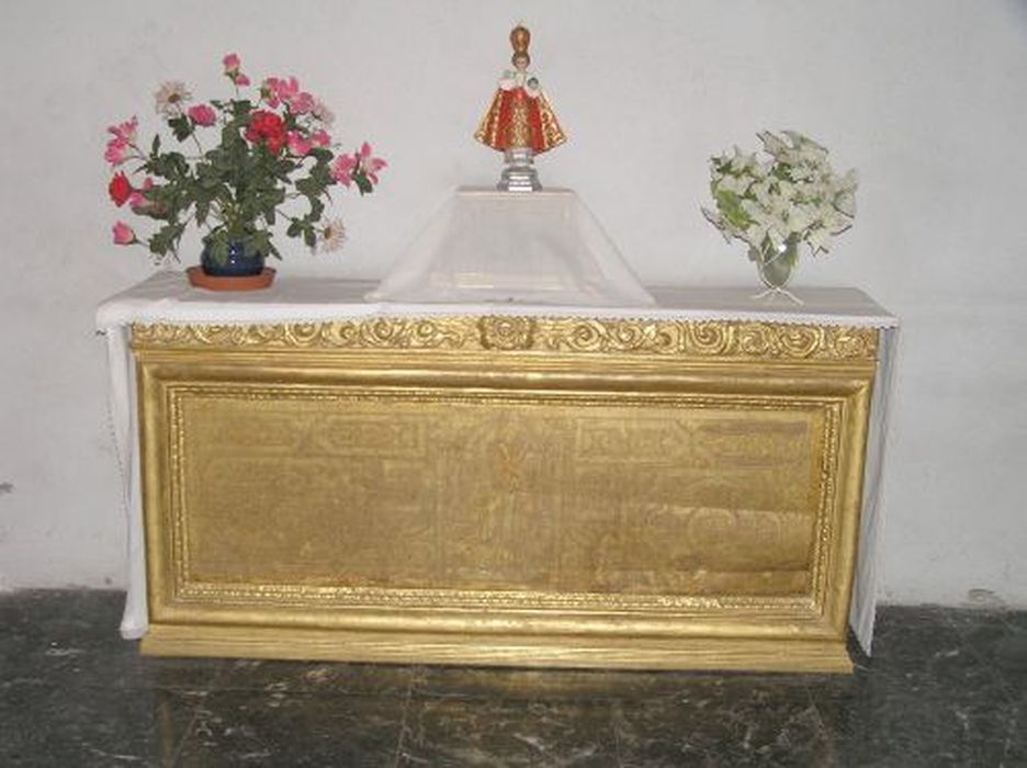Petit autel rectangulaire bordé d'une frise de volutes végétales en partie supérieure. Le devant d'autel est gravé.