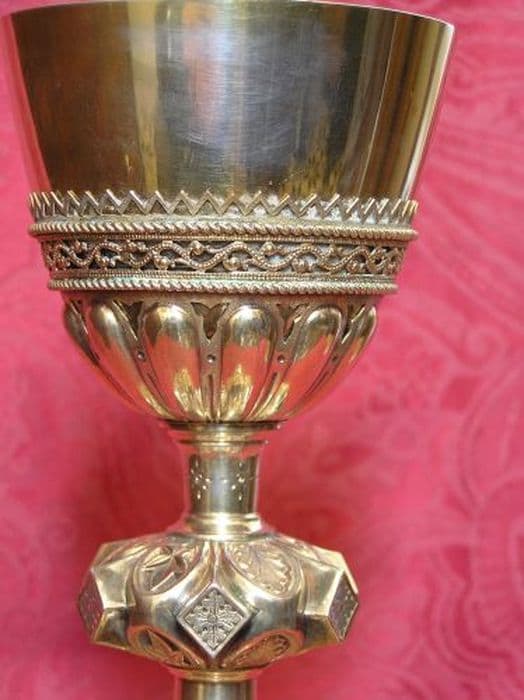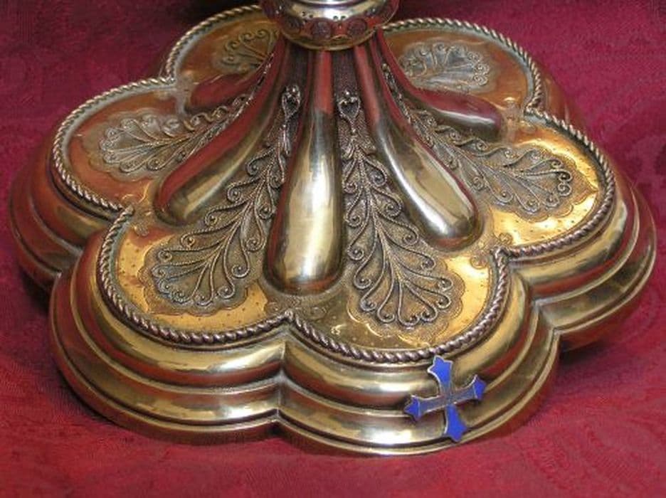 Calice néo-gothique argent doré. Pied sextilobe au redent convexe lisse chargé d’une croisette tridentée en émail bleu. Dessus à six côtes se rejoignant pour former le fût alternant avec une applique de fougère stylisée, l’ensemble souligné par une cordelette. Collerette basse circulaire décorée de petits cercles chargés d’une fleurette formée de petits points. Noeud à six bosses chargées d’une croisette dans un losange et décorées de feuilles de lierre et de feuilles stylisées. Fausse coupe ornée de longs godrons à la base surmontés d’une bande composé de deux cordonnets entrelacés entre deux cordelettes. Coupe évasée.