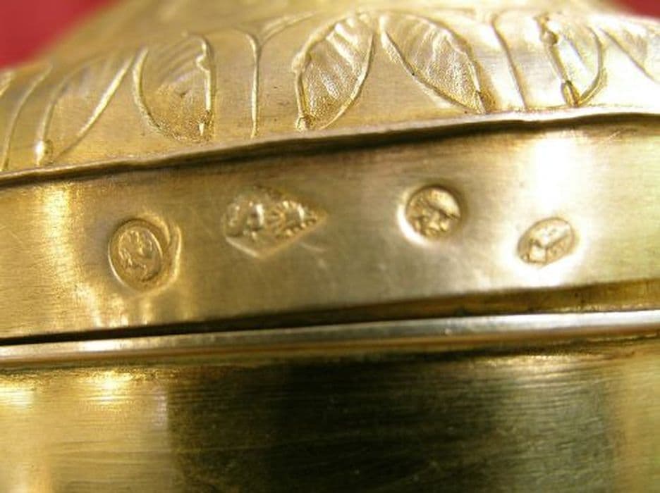 Ciboire en argent doré sur pied circulaire lisse surmonté d’un redent concave chargé de godrons. Dessus bombé orné de trois motifs de deux épis de blé alternant avec trois médaillons circulaires chargés d’une grappe de raisin feuillée et fruitée. Collerette basse décorée d’opercules et de perles alternées. Noeud ovoïde décoré de feuilles à la base et de feuilles d’acanthe au sommet. Cuve lisse. Couvercle à longs godrons rayonnants du coeur et bordure extérieure à la frise végétale. Croix tréflée.