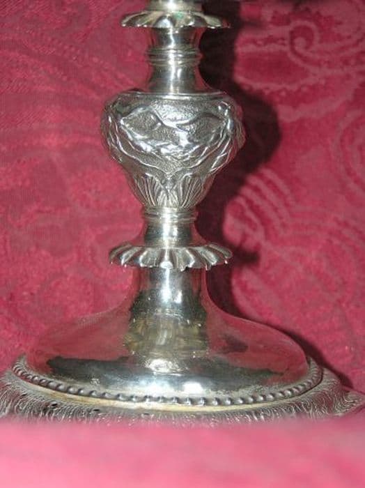 Ciboire en argent, et argent doré à l'intérieur de la cuve. Pied à bordure ajourée. Dessus bombé lisse. Collerettes basse et haute ondées. Noeud orné de feuilles d’acanthe à la base et de draperies au sommet. Cuve semi hémisphérique lisse. Couvercle en chapeau de gendarme décoré de feuilles d’acanthe rayonnantes et bordé d’un filet perlé, fixation à crochets.