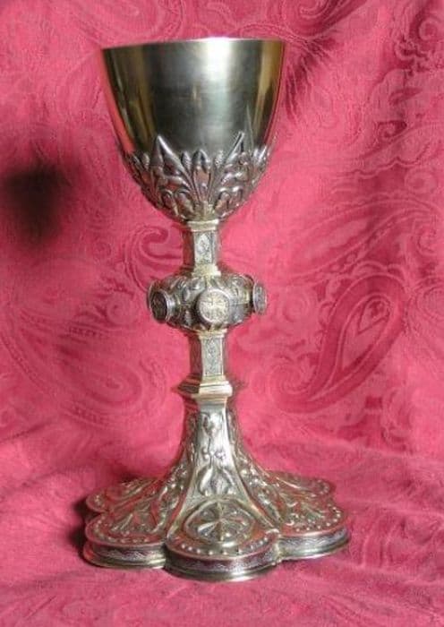 Calice et patène en métal argenté, coupe dorée intérieurement. Calice sur pied à six lobes, bord perlé, dessus formant six compartiments séparés par une nervure faisant alterner des décors quadrilobes et, deux caulicoles et une croix séparés par un décor végétal. Collerette basse unie à six côtés. Noeud plat à bosselages terminés par six boutons perlés chargés des lettres I E S U S et d’une croix. Tige à six faces. Coupe évasée unie, la base ornée de six palmettes.