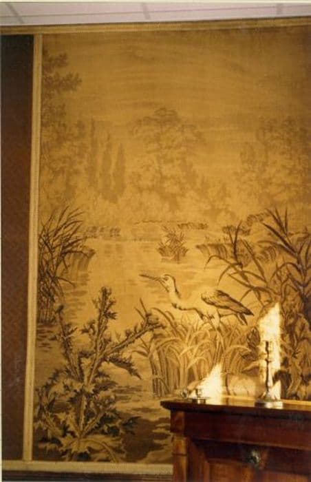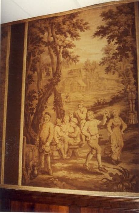 six pièces murales : Scènes de chasseurs, Sanglier, Héron, Biche au repos, Loup et cerf et Fête villageoise