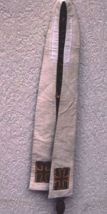 Etole en moire écrue, de forme droite décorée d'un morceau d'orfroi bordé de jaune et d'une croix pattée rouge soulignée de jaune. Doublure mais pas de franges.
