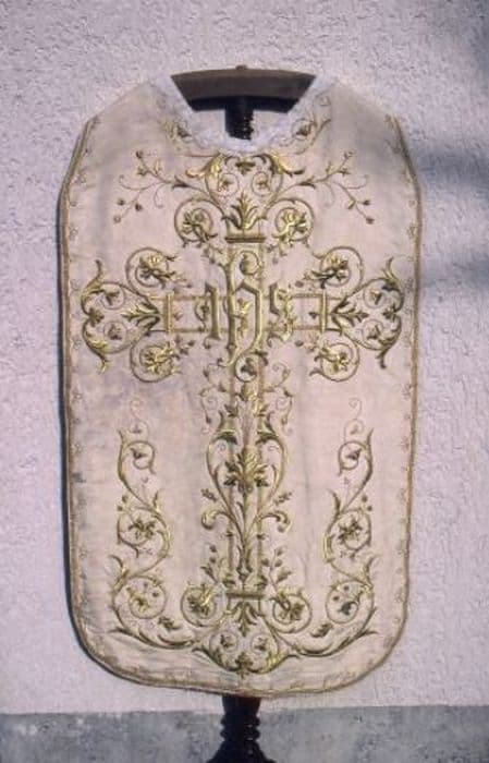 Chasuble en ottoman uni crème. Orfroi et croix brodés en relief de feuillages stylisées. Doublure coq de roche. Etole et manipule en ottoman uni crème, de forme tridentine, assortis à la chasuble, avec broderies dorées et franges d'or.