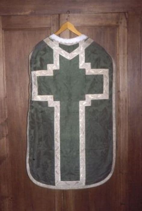 Chasuble en damas vert. Orfroi et croix à redents dessinés par une passementerie droite à la feuille de chêne et à la grappe de raisin d'argent, encadrant un damas vert à décor symétrique. Doublure mastic. Etole, manipule de forme tridentine et voile de calice en damas vert assortis à la chasuble.