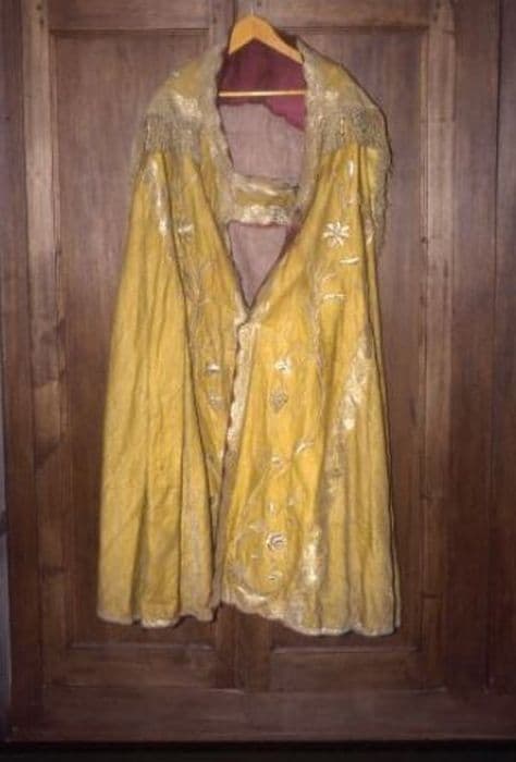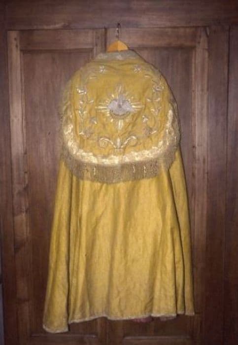 Chape en reps moiré rouge. Orfrois délimités par une passementerie ondée de feuilles de chêne et fleurettes d'or, ornés de rinceaux brodés en relief de roses, d'épis de blé et de grappes de raisin métalliques. Chaperon décoré des mêmes broderies entourant un pélican d'argent, aux entrailles de gueules dans son aire d'or le tout en relief rayonnant d'or bordé d'une passementerie et de franges dorées. Doublure vieux rose avec des ajouts.