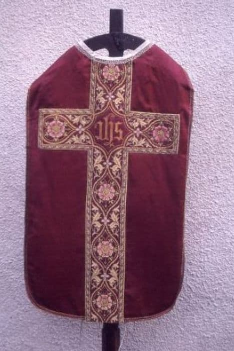 Chasuble en satin brillant rouge profond. Orfroi et croix en broderie mécanique de rinceaux dorés surbrodés de fleurs à six pétales en soies roses. Doublure pourpre.