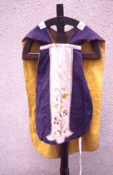 Chasuble en reps violet profond. Orfroi et croix ancrée en damas ivoire, à motif de croix de feuillage et croisette dans des quadrilobes brodés d'oeillets au naturel, tigés et feuillés de vert. Au centre de la croix : IHS gothique brodé en soie jaune. oublure bouton d'or