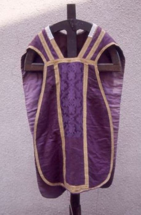 Chasuble en damas violet à motif de deux types de croix feuillées dans quadrilobe, un grand et un petit. Orfroi et croix dessinés par passementerie droite dorée de feuilles stylisées en guirlande. Croix chargée en coeur d'une broderie mécanique dorée représentant le monogramme du Christ en lettres gothiques dans un ovale entouré des quatre bras d'une croix grecque formée par des rinceaux enserrés dans une couronne (orfroi rapiécé). Doublure violette. Bourse en damas violet assorti à la chasuble.