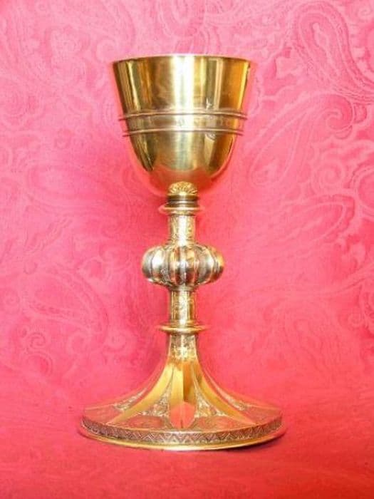 Calice et patène métal doré, dans un coffret bois, au couvercle arrondi couvert de tissu noir et tapissé de velours rouge. Le calice est formé d'un pied rond souligné d’un décor vivré, orné sur le dessus orné de sept quadrilobes et d’une croix tréflée dans un anneau. La base de la tige est constituée par huit nervures formant des palmes. Collerettes basse et haute lisses. Noeud à douze côtes de melon proéminentes. Coupe importante évasée.