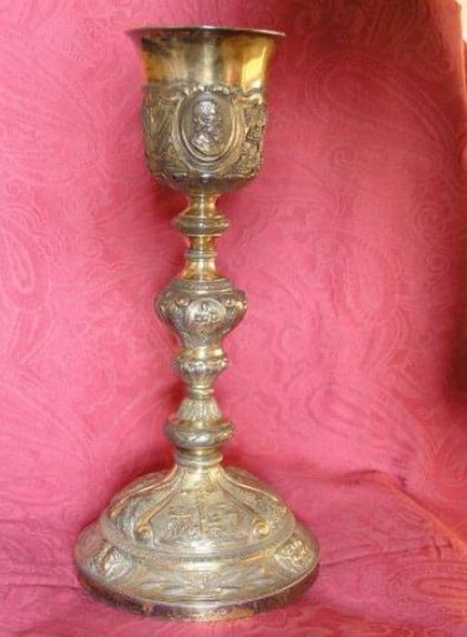 Calice en métal doré sur pied rond, surmonté d’un ressaut décoré de trois groupes de deux têtes d’angelots et de trois motifs de masses de roseaux noués au centre par un ruban. Dessus bombé chargé de trois gravures en relief dans un cartouche, et en bordure, un filet de feuillages. A la base du fût, fine collerette striée en biais. Collerette basse ornée d’une tresse de lauriers, surmontée de palmettes. Noeud en forme d’urne à double volute, décorée, en partie basse, de palmes, et en partie haute, de trois motifs encadrant trois médaillons ovales. Collerette haute chargée d’une tresse de lauriers. Fausse coupe ajourée, soutenue par des palmes avec trois têtes de profil en médaillon ovale. Coupe évasée.