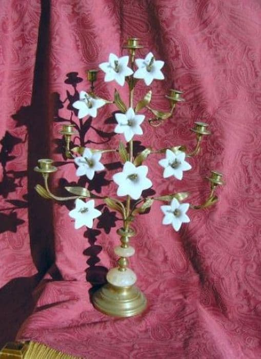 Deux chandeliers haut en laiton à sept branches. Pied rond avec deux collerettes en porcelaine translucide. Fût rond portant trois niveaux de branches terminées par une bobèche et dix fleurs de liseron en porcelaine blanche.