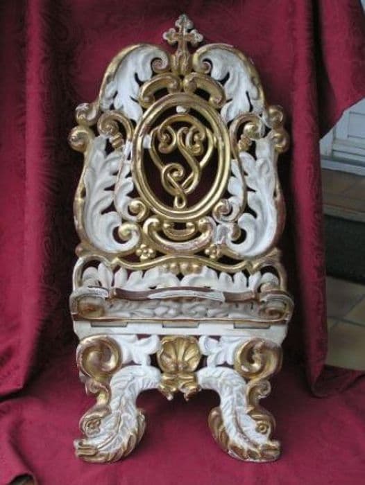 Lutrin en bois sculpté doré et argenté baroque. Pieds ajourés à volute de feuillage, orné au centre d'une coquille. Face arrière en forme de cartouche décoré de feuillages sommé d’une croix tréflée.