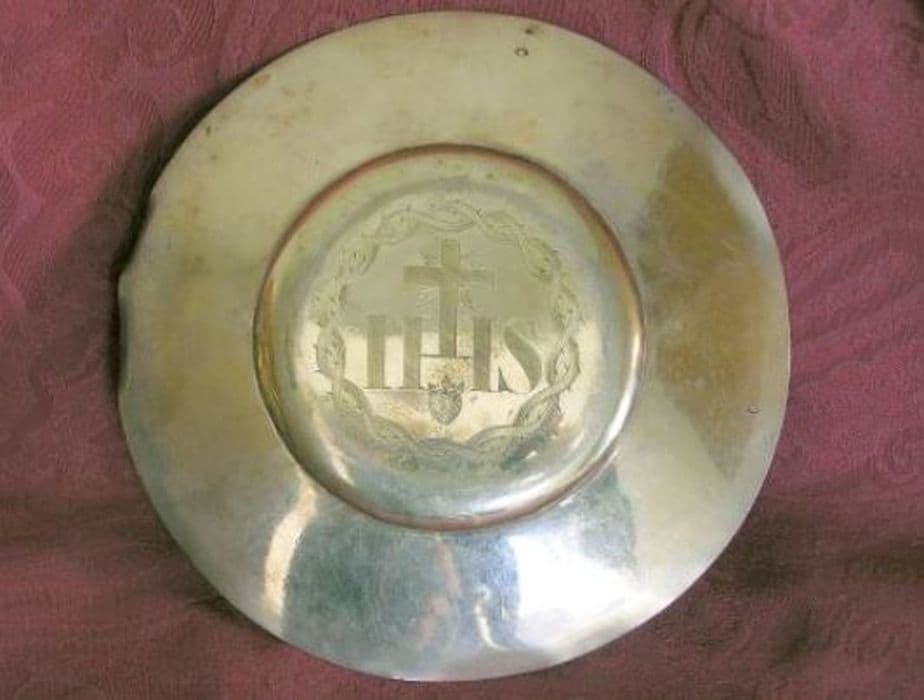Patène ornée du monogramme du Christ sommé d’une croix latine et soutenu par un coeur transpercé des trois clous de la Passion, le tout entouré d’une couronne d’épines.