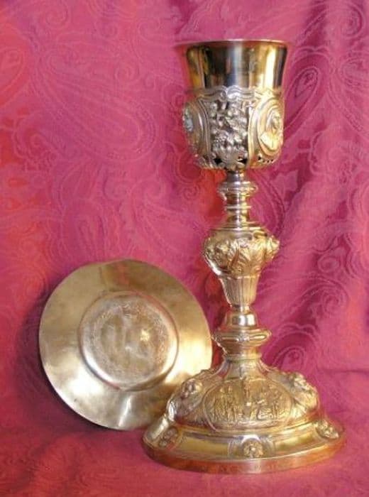 Calice en argent doré et sa patène en métal doré dans un coffret cylindrique en bois gainé de tissu noir et tapissé de velours rouge. Pied rond surmonté en bordure de six cartouches allongés unis séparés par six rosaces de deux modèles baroques. Collerettes haute et basse à décor de deux rubans unis formant des ronds et des ovales. Noeud ovoïde allongé, base feuillée, partie centrale comportant trois cartouches de motifs liturgiques : épis de blé, grappes de raisin, masses de roseaux alternant avec des groupes de deux têtes d’anges. Fausse coupe ajourée. Coupe en forme de tulipe.