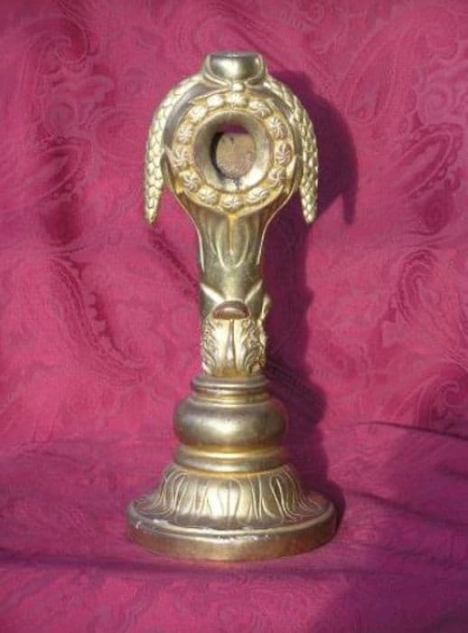 Présentoir sculpté en bois doré sur pied rond avec dessus bombé décoré de larges feuilles stylisées. Fût avec feuille d’acanthe en relief. Monstrance entourée d’une couronne de rosaces en relief, sommée de deux nattes feuillées retombant de part et d’autre, le tout surmonté d’une boule.