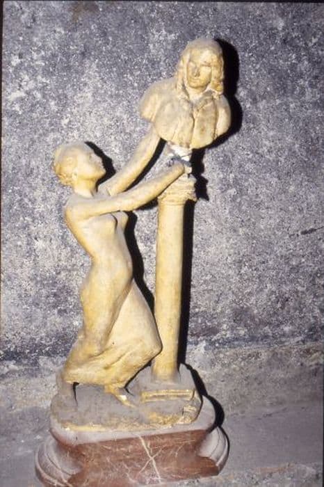 Une femme, allégorie de la philosophie, tient des deux bras le buste de Bayle, posé sur un haut piédestal.