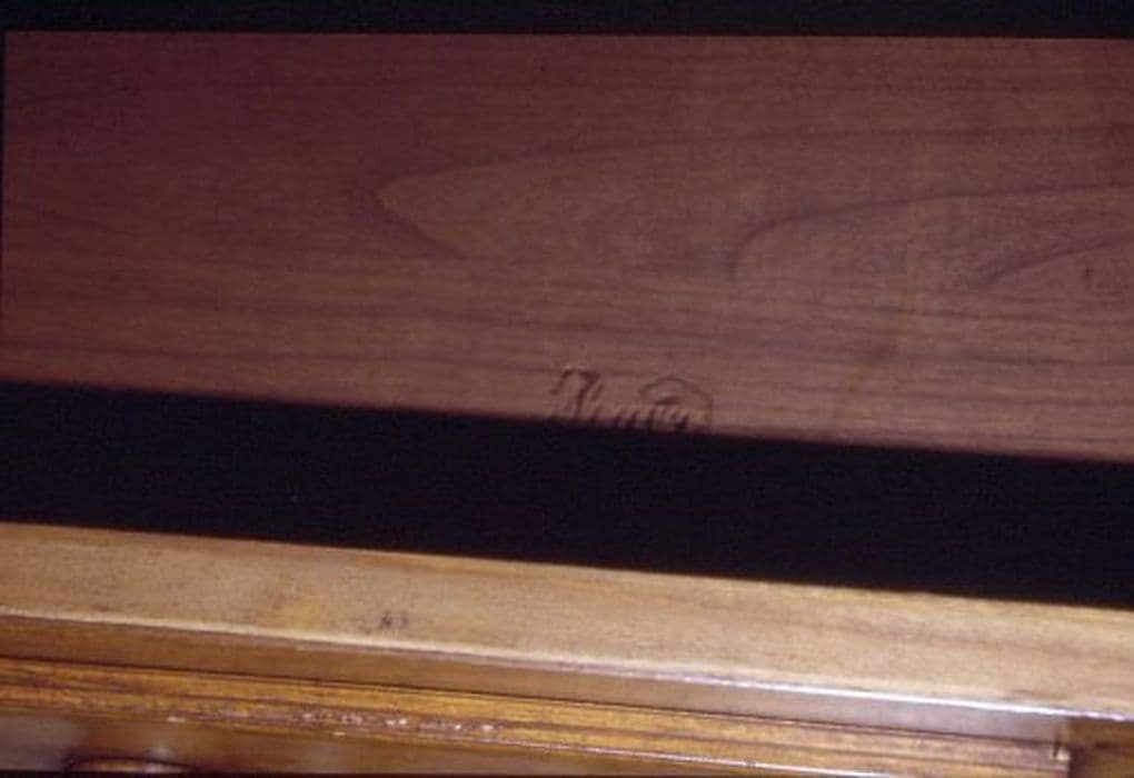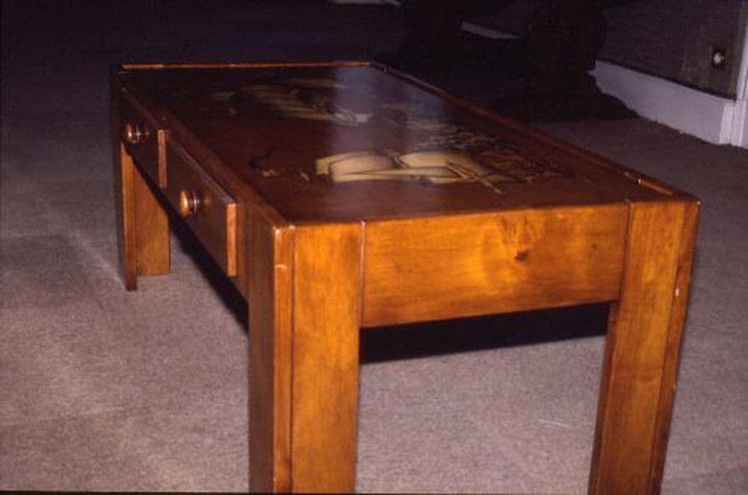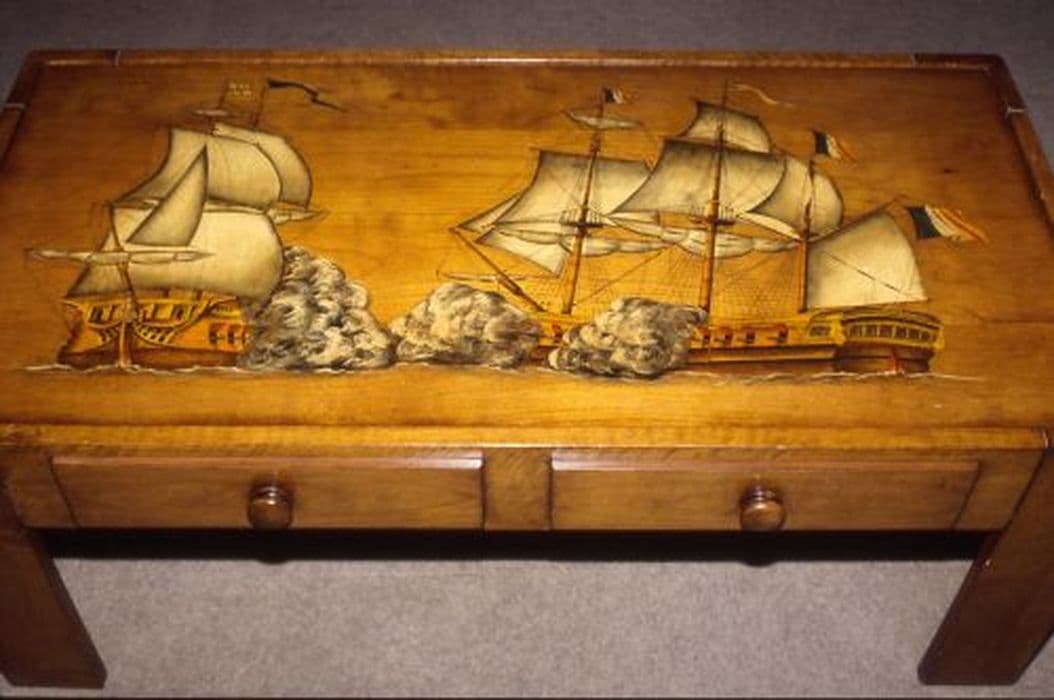 Table de marine en bois à deux tiroirs, peint sur le dessus.