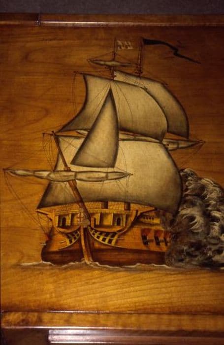 La scène peinte représente un combat naval entre deux vaisseaux du 18e siècle, l’un français, l’autre indéterminé.