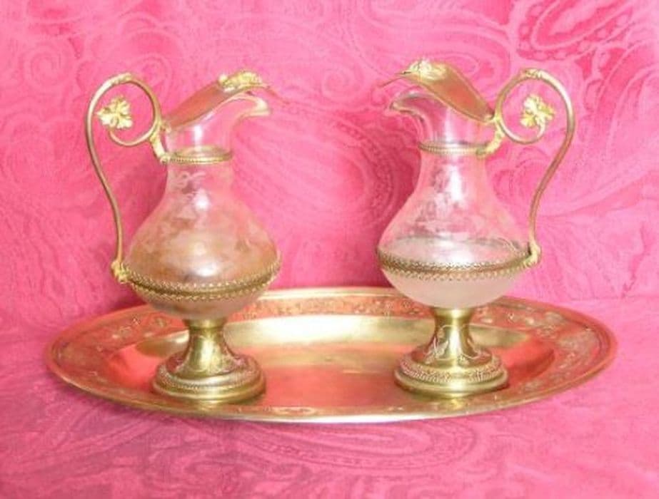 Plateau ovale au marli décoré de motifs emboutis. Deux burettes à pied circulaire, fût à décor végétal, cuve en verre, couvercle métallique et anse terminée par une feuille de vigne.