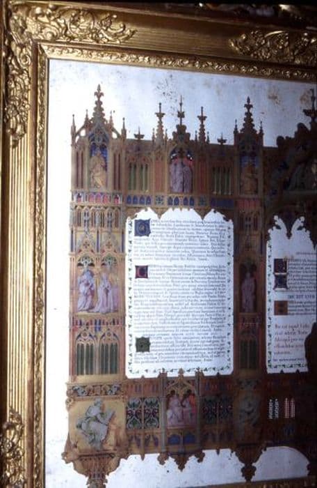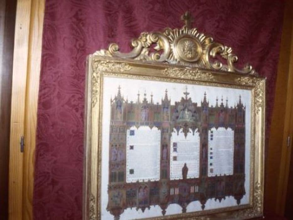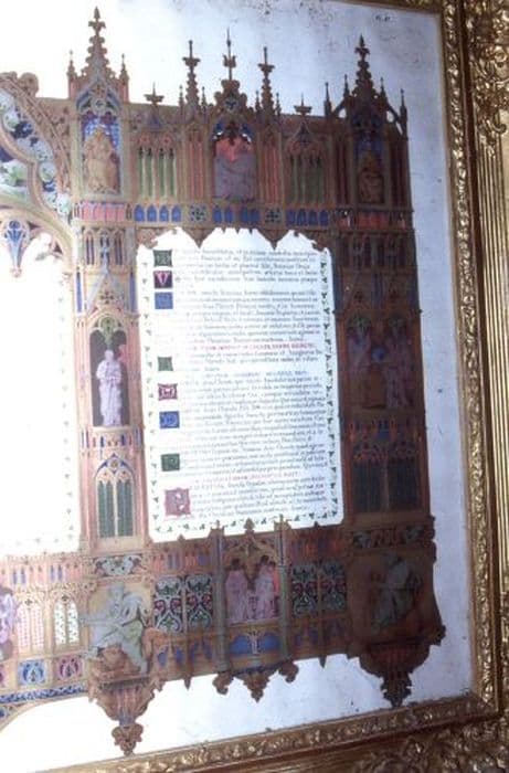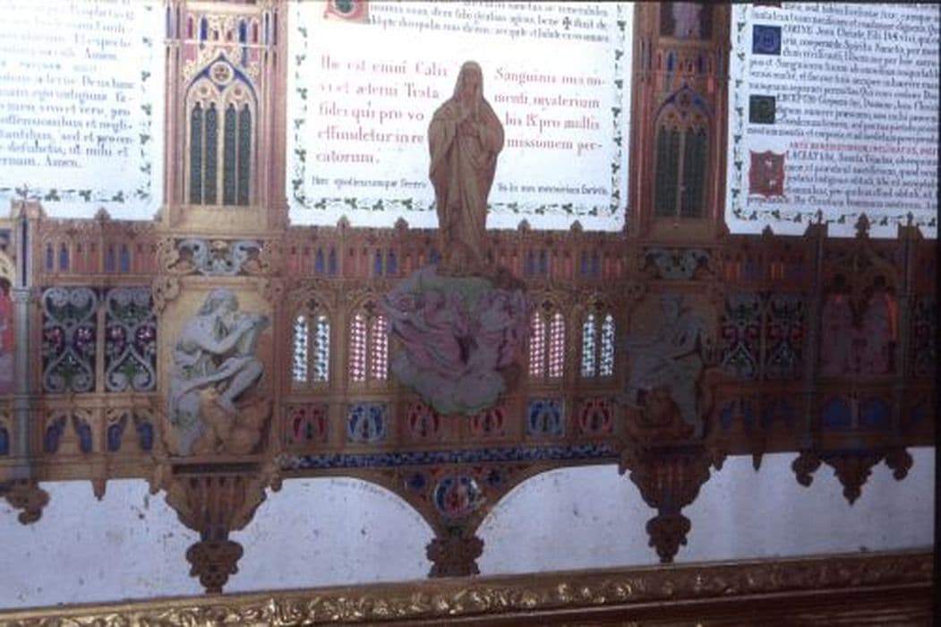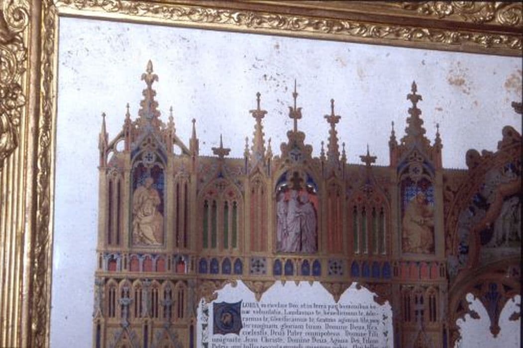 Canons d’autel en lithographie de style gothique flamboyant, orné de niches abritant des scènes et des personnages, cantonnées et sommées de pinacles. L’ensemble est inséré dans un cadre mouluré en bois doré, la partie supérieure décorée d’un médaillon avec un entourage à volute et sommé d’une croix latine.