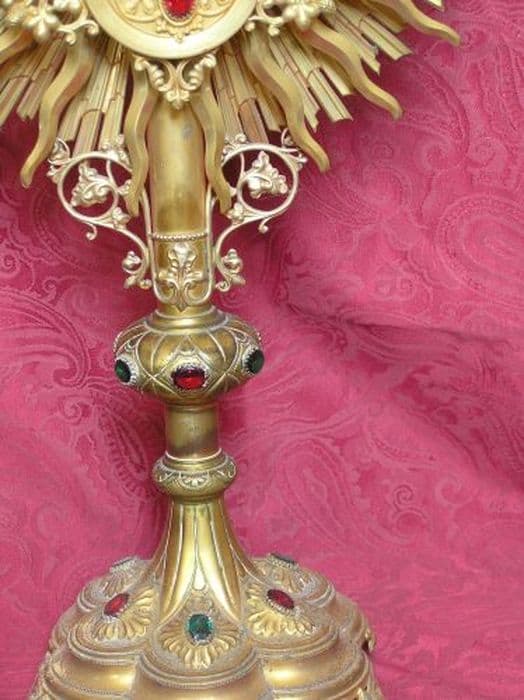 Ostensoir néo-gothique doré. Base à six pieds à décor végétal, dessus à la bordure nervurée et six jours ronds chargés d’une fleurette colorée. Collerette basse. Noeud à bossette avec six pierres colorées. Entourage de la monstrance en forme de croix grecque arrondie, frappée de quatre cabochons : deux rouges et deux verts. Gloire double : rayons droits et rayons flammés. Croix supérieure tridentée.