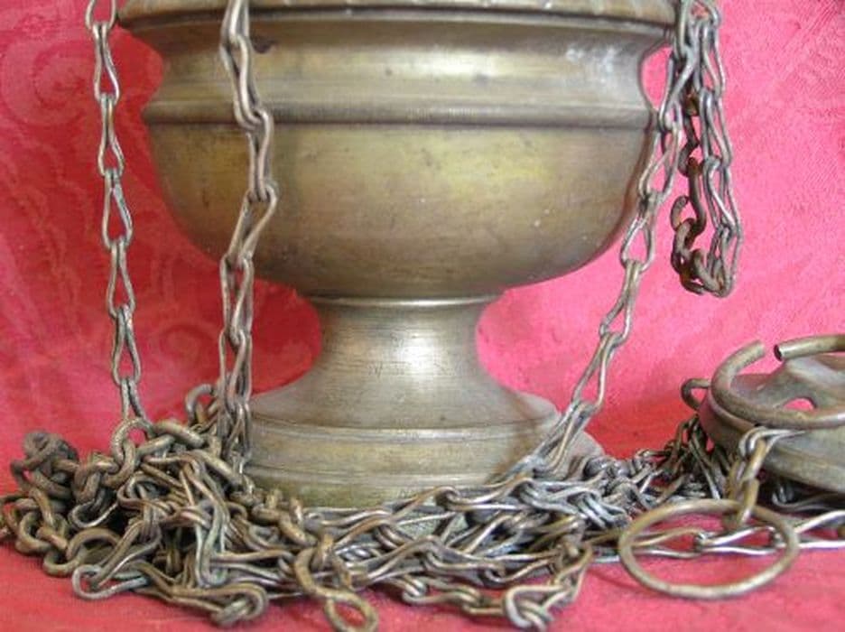 Encensoir en laiton argenté. Pied uni rond. Cuve unie. Cheminée à la bordure festonnée, redent percé d’orifices circulaires, redent supérieur uni. Chapeau rond percé de languettes ovales.