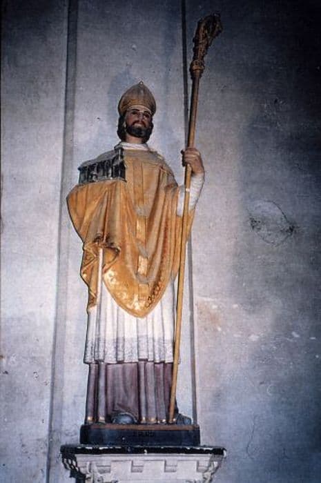Le saint est représenté en évêque, coiffé de la mitre, vêtu de la chape et tenant la crosse de la main gauche et une maquette d'église de l'autre.