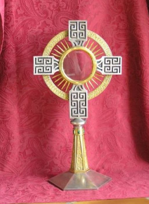 Ostensoir art déco en métal. Pied hexagonal en métal argenté. Fût en bronze doré à six faces décorées de rameaux de laurier et insérant six pièces allongées en ivoire. Collerette en anneau chargée de six cabochons rectangulaires en malachite. Noeud circulaire, le sommet en cône en métal banc. Croix en métal blanc décoré de grecques très marquées. Monstrance circulaire en métal doré. Gloire à rayons droits dorés, entourés d’un grand anneau en métal doré orné de petits anneaux reliés par deux rubans.