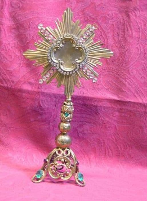 Reliquaire en métal doré, sans reliques. Base tripode ajourée chargée de pierres verte et rouge insérant un motif trilobé. Noeud composé de deux boules lisses, surmontées d’un motif. Monstrance quadrilobe entourée de pierres blanches. Gloire à rayons droits dissymétriques séparés par quatre rayons de cinq pierres blanches.
