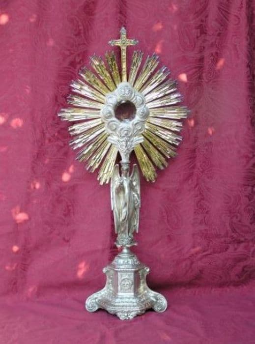 Ostensoir en métal argenté, gloire dorée, lunule en argent doré, dans un coffret en bois gainé de tissu noir et blanc à l'intérieur. Quatre pieds, deux à volutes alternant avec deux à rinceaux. Dessus à six pans avec méplat orné de carreaux et élément concave frappés d’un treillis. Base tronconique à six côtés avec deux médaillons perlés. Partie haute à six pans avec méplat orné de carreaux surmonté d’une partie chargée d’un opercule posé sur un blason baroque. Fût constitué par un ange debout sur un piédouche, les ailes pliées, la main droite enseignante, la main gauche tenant un livre. Extrémité supérieure du fût en forme de palmier, sommé d’un bouquet d’épis de blé. Nuées entourant la monstrance chargée de quatre têtes d’anges : deux en chef, une de part et d’autre. Rayons droits. Croix travaillée.