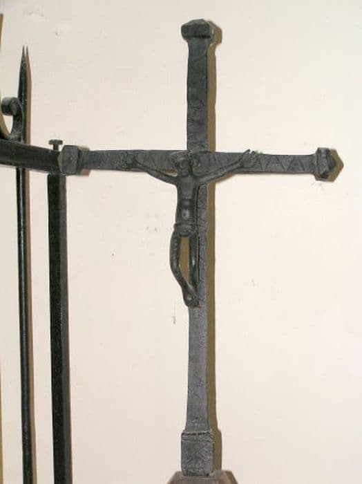 Croix en fer forgé dont les bras se terminent en carrelet. La partie basse est conique à quatre pans.