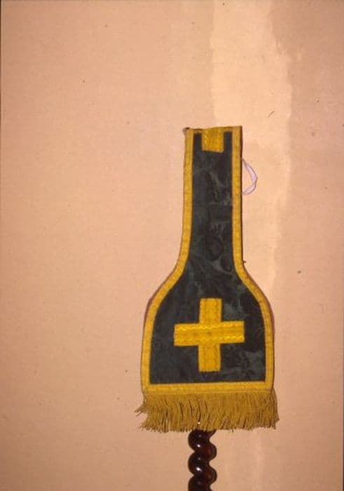 Manipule en damas vert, de forme triangulaire, assorti à la chasuble (PM09004250), avec croisette de passementerie. Franges jaunes. Doublure vieux rose.