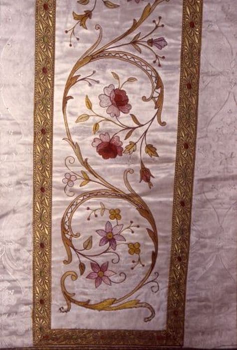 damas (blanc) : brodé ; fil métal (or) ; matériau textile