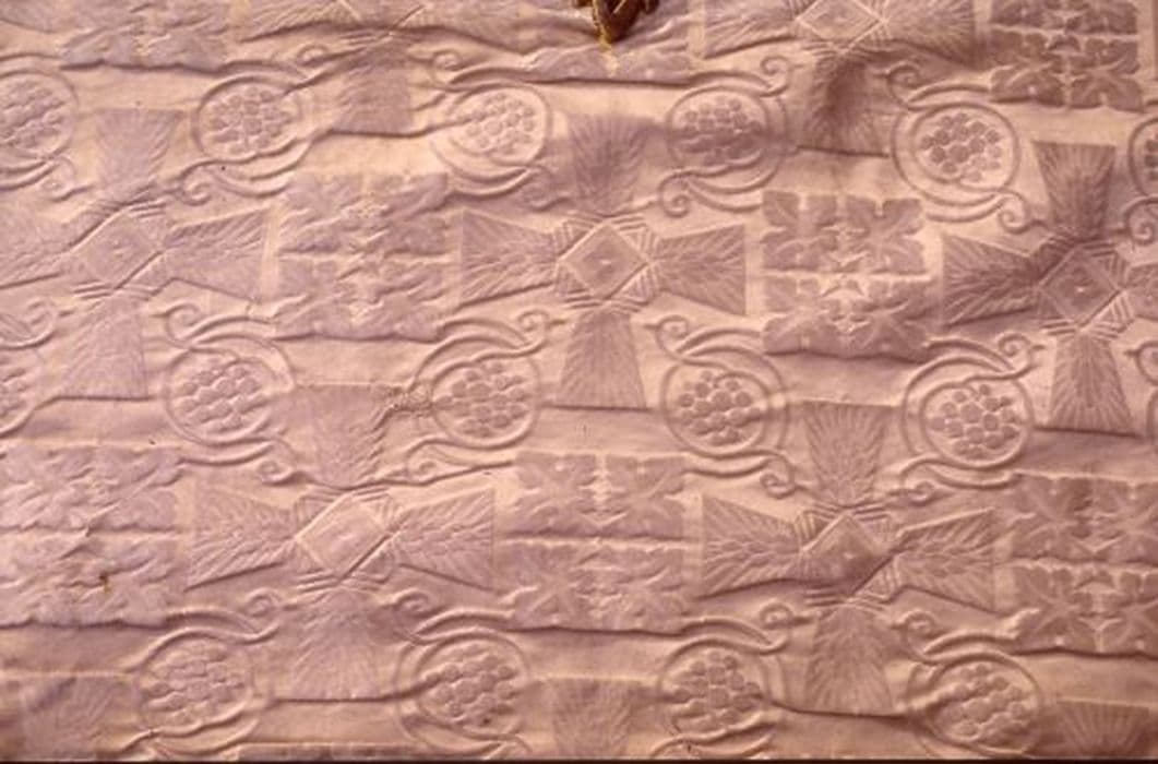 damas (blanc) : brodé ; velours uni (rouge) ; matériau textile ; fil métal (or)