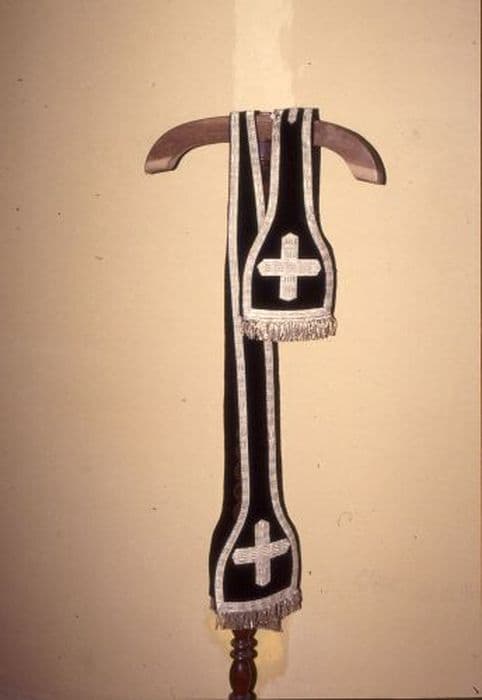 chasuble (2) ; étole de clerc (2) ; manipule (2) ; voile de calice (2) ; bourse de corporal (2) ; ornement liturgique catholique