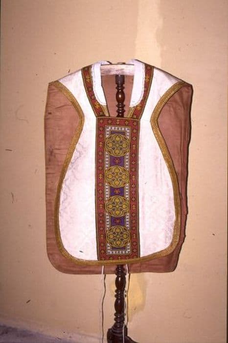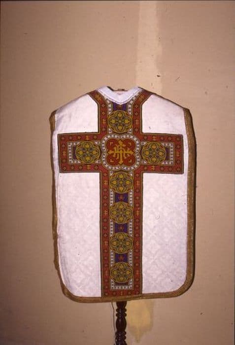 Chasuble en damas blanc à motifs de croisettes pattées bifourchées dans un quadrilobe à redents. Orfroi et croix droite de Saint-Lazare en tapisserie rapportée : bordure rouge avec deux décors de trois étoiles à six branches séparées par une croix de Lorraine, le tout jaune. A l'intérieur, une croisette jaune sur fond vert pale entouré d'un quadrilobe et d'un cercle jaune, avec l'encoignure rouge, brochant sur une bande violette bordée d'une bande blanche chargée de points jaunes. Au coeur de la croix : IHS gothique entravaillé avec une croisette aiguisée d'or sur fond rouge, dans un quadrilobe à redents jaune. Bordure extérieure en passementerie droite à points d'or. Doublure vieux rose.