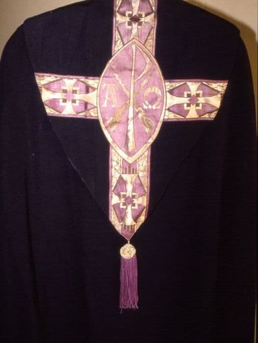 Chape néo-gothique en reps uni noir. Chaperon triangulaire chargé d'une large bande de passementerie droite de huit centimètres posée en croix, au fond de losanges mauve foncé chargés de croisettes pattées dorées ; en coeur, dans un grand ovale mauve foncé les lettres P et X cantonnées d'un A, du même. Gland violet de seize centimètres. Doublure violet rosé.