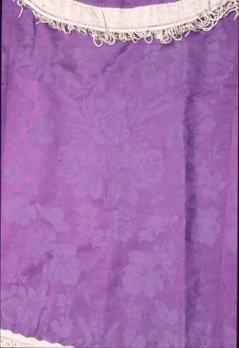 Chape composite en damas violet, ornée sur le devant d'une croisette fleurie terminée par des couronnes d'épines, dans des quadrilobes très allongé, reliés par des feuillages, et sur le dos d'une composition de roses, d'églantines, d'épis de blé et de grappes de raisin feuillées. Orfrois dessinés par passementerie ondée d'argent : feuille de chêne et fleurette à six pétales. Dosseret souligné par une passementerie ondulée identique, chargé en coeur d'un IHS en relief, brodé d'argent, soutenu par les trois clous de la Passion et sommé d'une croix fleurdelisée du même, le tout rayonnant de paillettes d'argent. Franges d'argent de sept centimètres. Doublure : vieux rose pour le bas et violet pour le haut.