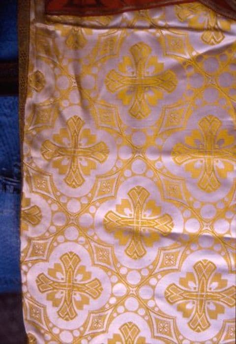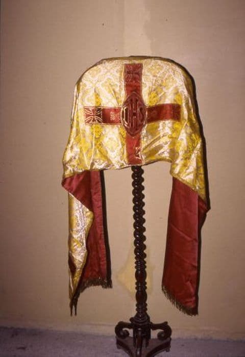 Voile huméral en damas blanc orné d'un décor de croisettes pattées bifourchées avec rayons stylisés jaune, le tout dans des quadrilobes très travaillés. Au centre, ajout d'une passementerie droite rouge, chargée de croix pattées d'or et surchargée, en coeur d'un losange rubis abritant un IHS d'or, brodé du même. Même décor sur le bras. Le tout bordé d'une passementerie fine droite : grappe de raisin feuillée. Franges d'or de cinq centimètres. Doublure rouge.