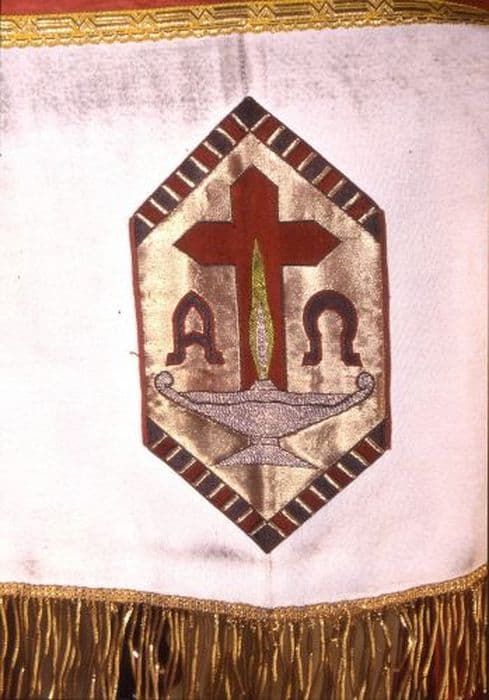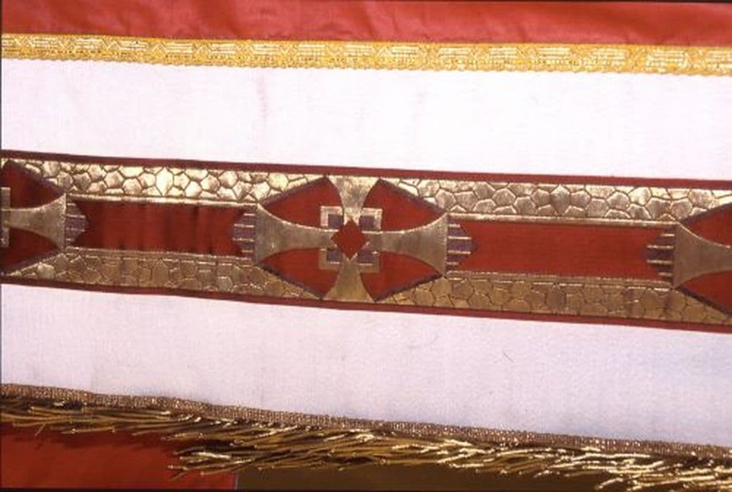 Grand antependium à ondulations en reps blanc orné d'une large bande de passementerie droite à fond rouille chargée de croisettes pattées d'or, dans des losanges, le tout bordé d'une imitation de carrelage irrégulier doré. Au centre, dans un losange tronqué à bord doré, une lampe d'argent à la flamme du même, bordée de vert clair, brochant sur une croix latine aiguisée rubis, cantonnée de deux lettres noires, bordées de rouge (A et une lettre illisible). Franges dorées de six centimètres. Doublure rouge.