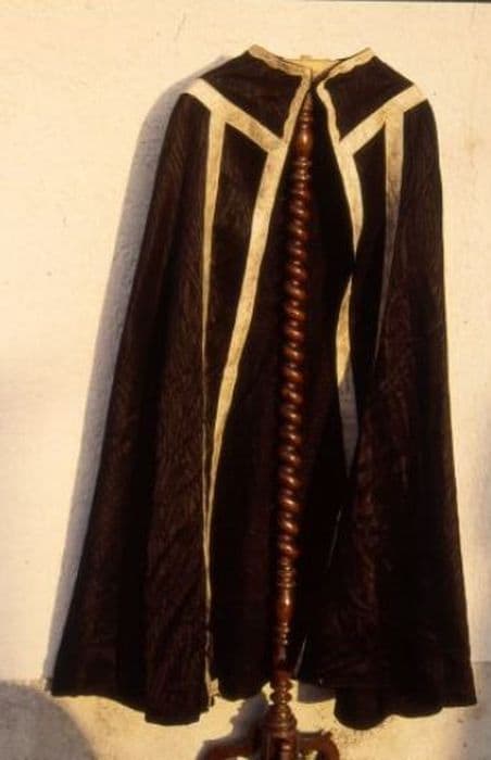 Chape noire, de forme moderne. Orfrois et triangle du chaperon fixe dessinés par passementerie droite à feuille de chou et fleurette boutonnée à six pétales. Chaperon terminé par un gland d'argent. Doublure noire.