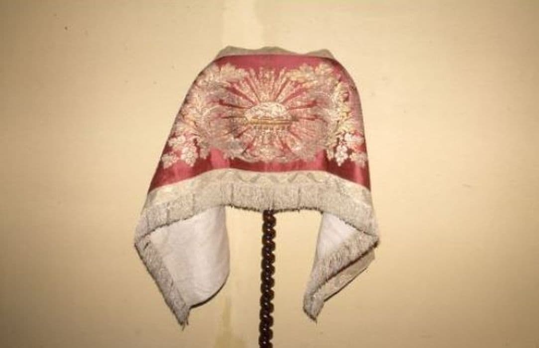 Grémial en soie rouge. En coeur : décor au masque d'un agneau couché sur une croix et un livre dorés, aux sept sceaux d'argent, le tout rayonnant d'argent, entouré de rinceaux de feuillages dorés, nervés d'argent, de fleurs, de grappes de raisin et d'épis de blé argentés. Passementerie droite dorée : feuille de vigne ondée et grappe de raisin. Doublure blanche.