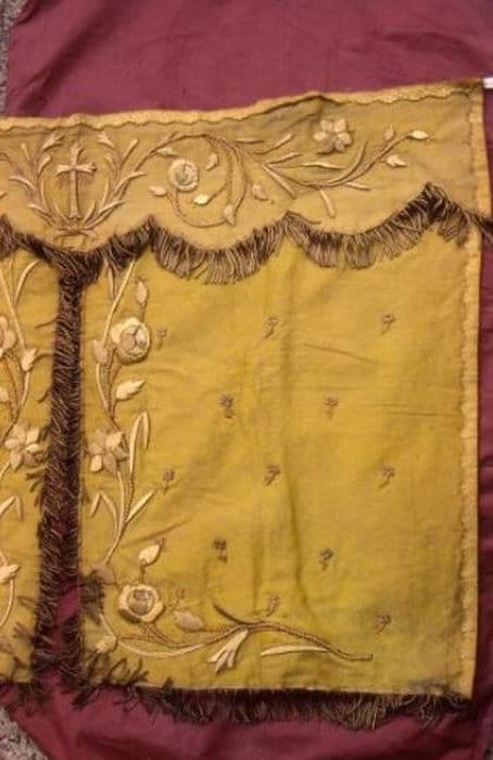 Grand conopée en drap d'or, bordé d'une petite passementerie ondée intérieurement, droite extérieurement : feuille de chêne et fleur boutonnée à six pétales. Broderies de fleurettes dorées à quatre pétales, boutonnées de quatre points d'argent. Sur les côtés intérieurs : broderies en relief de rinceaux fleuris de roses dorées. En corniche, broderies de rinceaux identiques, au centre : croix latine enhendée d'or, rayonnante de rouge. Franges dorées. Doublure rouge.