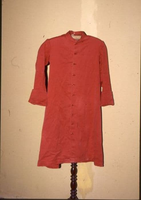 Tenue d'enfant de choeur en drap rouge. Col droit, petits boutons rouges, revers aux manches, plis en creux dans le dos. Sans doublure.